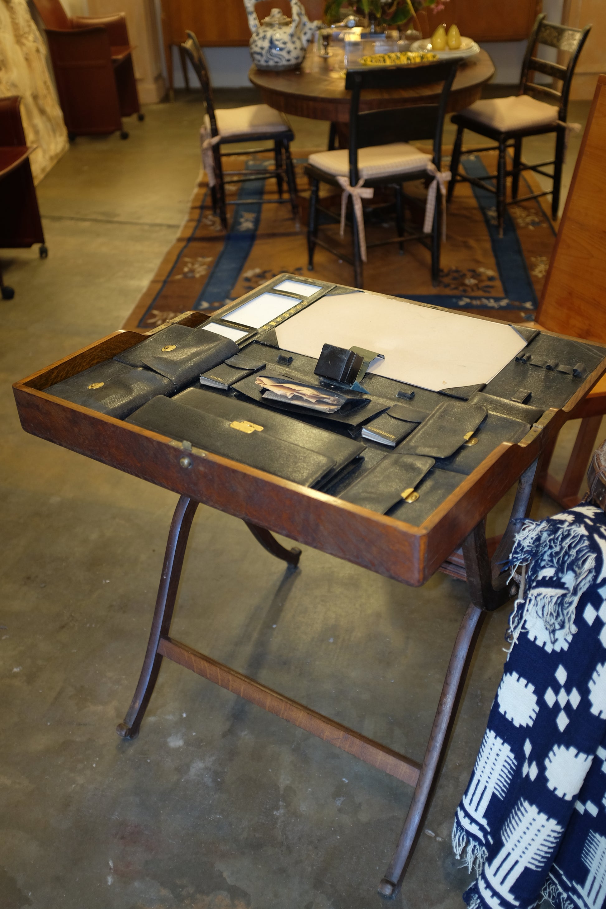 Fold-up oak 19th century campaign desk with beautifully curved legs. Interior fitted with leather compartments and some original pull-out elements including a small notebook. Inkwell at center is partially loose and does not sit completely flat.
