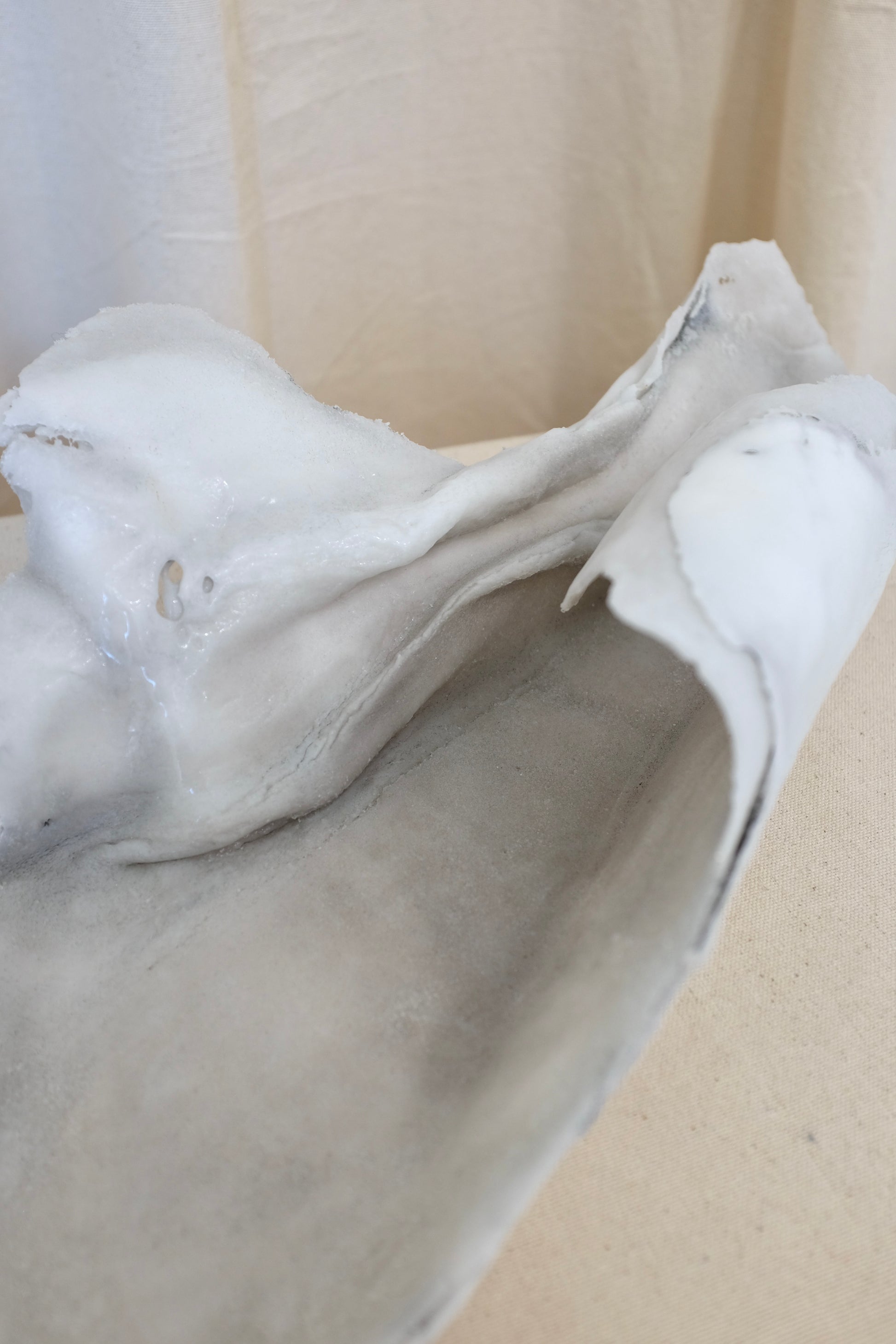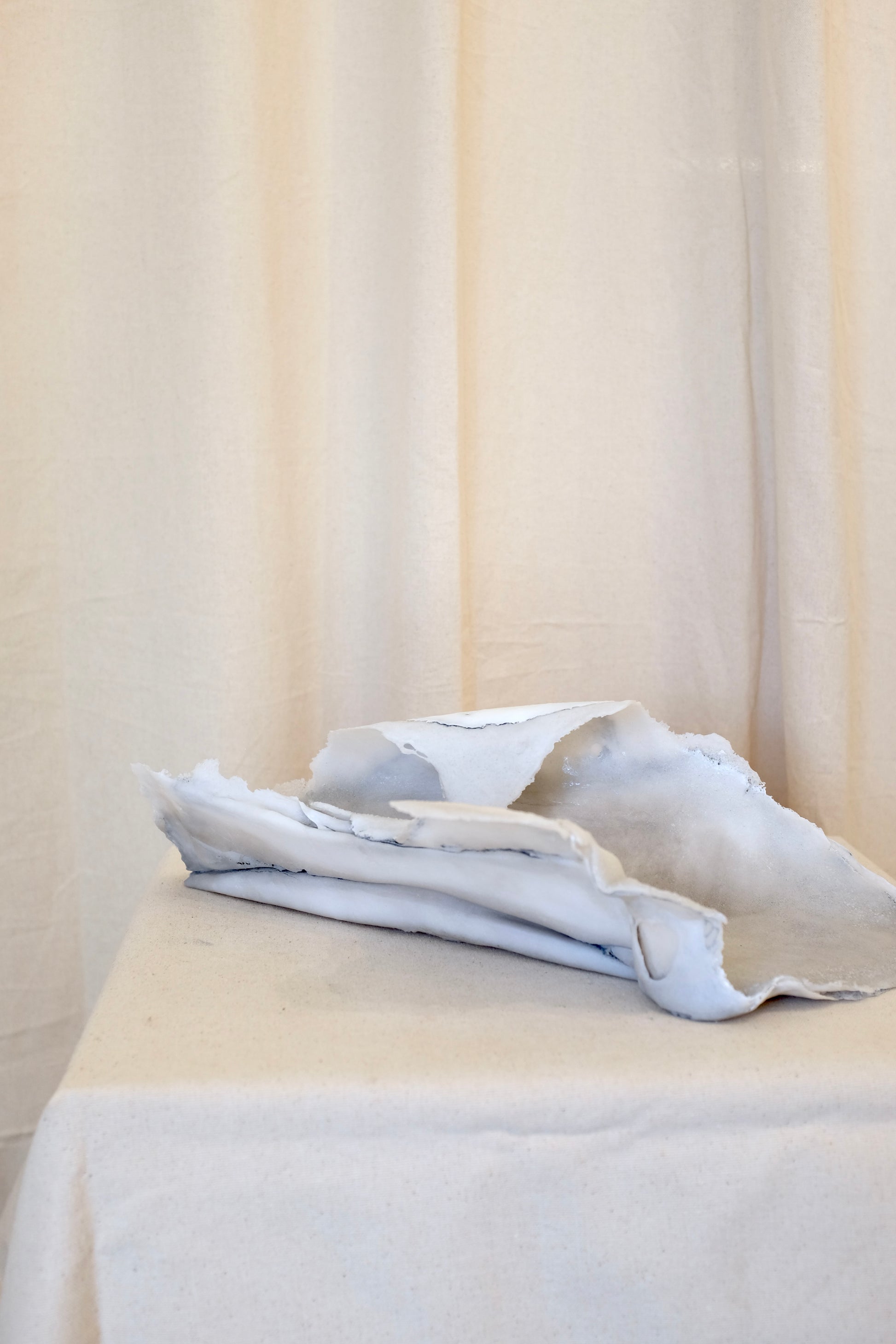 Ethereal, paper-like glass sculpture in pale gray that reads white.