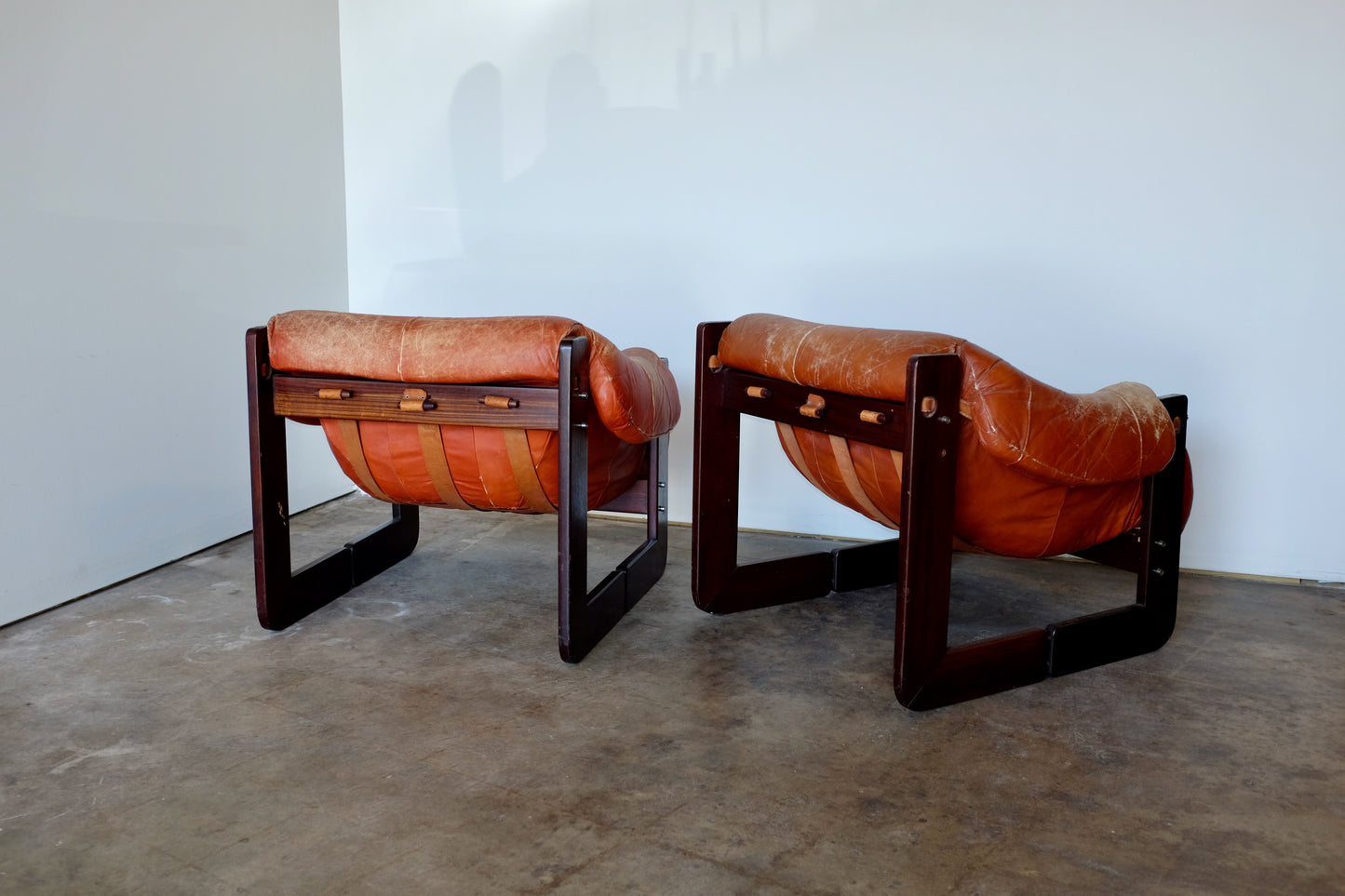 Percival Lafer MP97 chairs in original light leather with heavy patina, including some seam tears in seats. Patina lovers, enjoy. Patina dislikers, we have other MP97s in the same leather color without the patina.