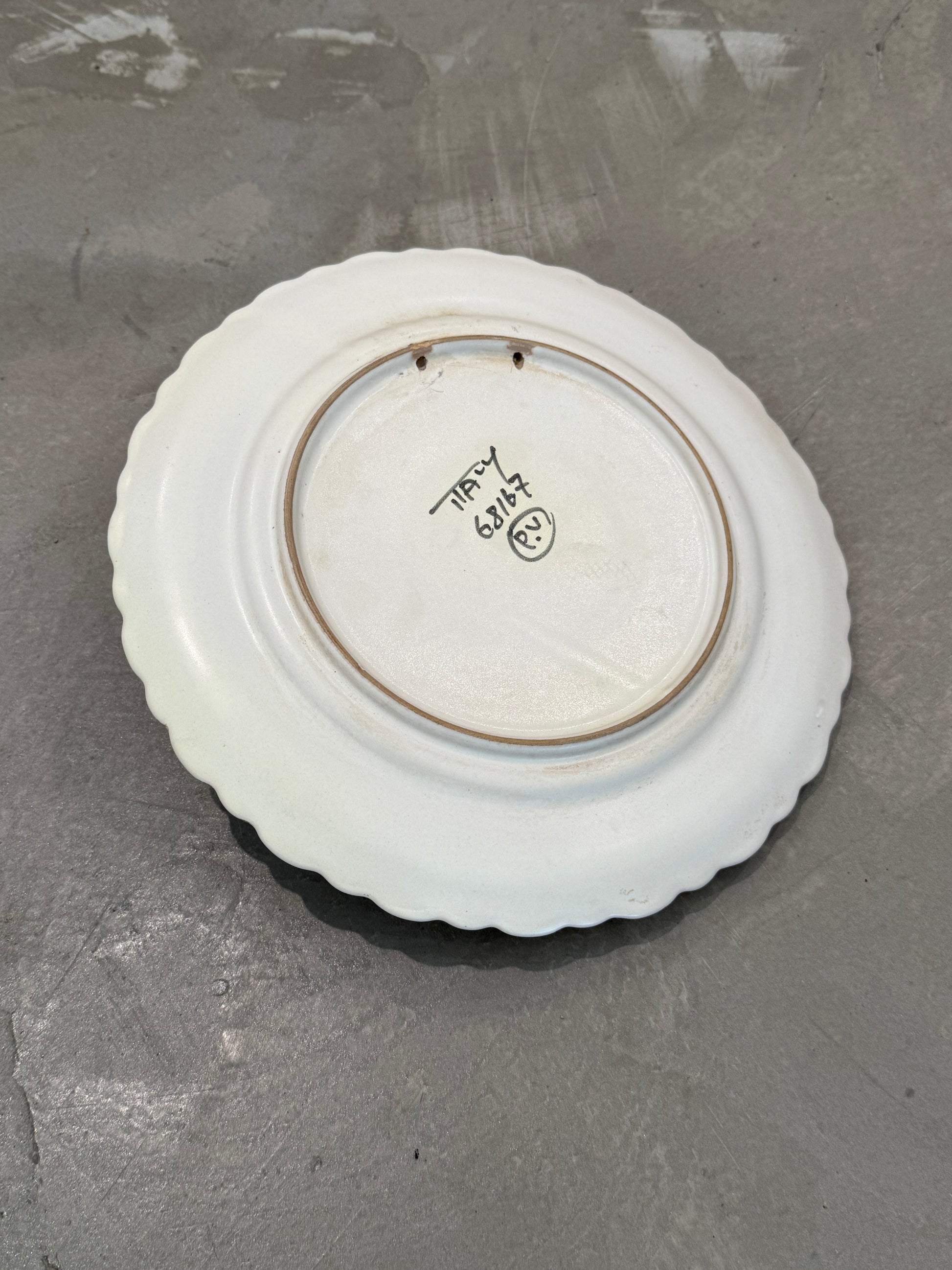Italian ceramic trompe l'oeil white scalloped and floral decorated plate of fruit and nuts, including figs, walnuts, and pears.